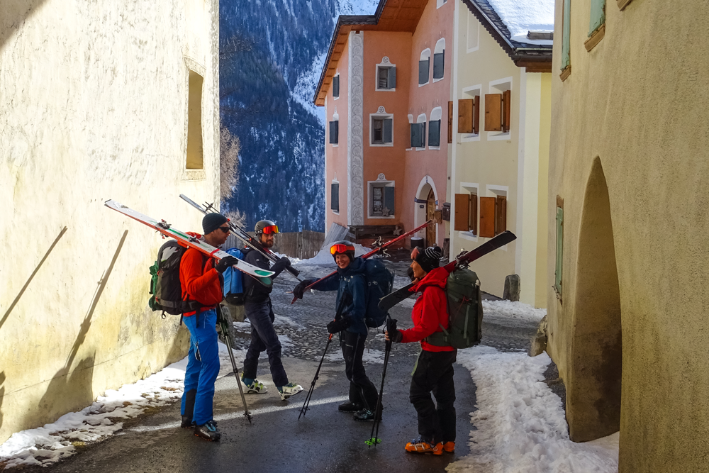 Mein Blick schweift aus dem Zugfenster und meine Gedanken zu den nächsten Tagen: Wie wohl meine Tourengspändlis sein werden? Wird die Bise die Tourentage stark mitprägen? Wie wird es auf den Gletschern sein? Der Lautsprecher meldet den nächsten Halt und reisst mich aus meinen Gedanken. Draussen ist sofort klar, wer alles zur Gruppe gehört: die einzigen sechs Personen auf dem Perron von Guarda.